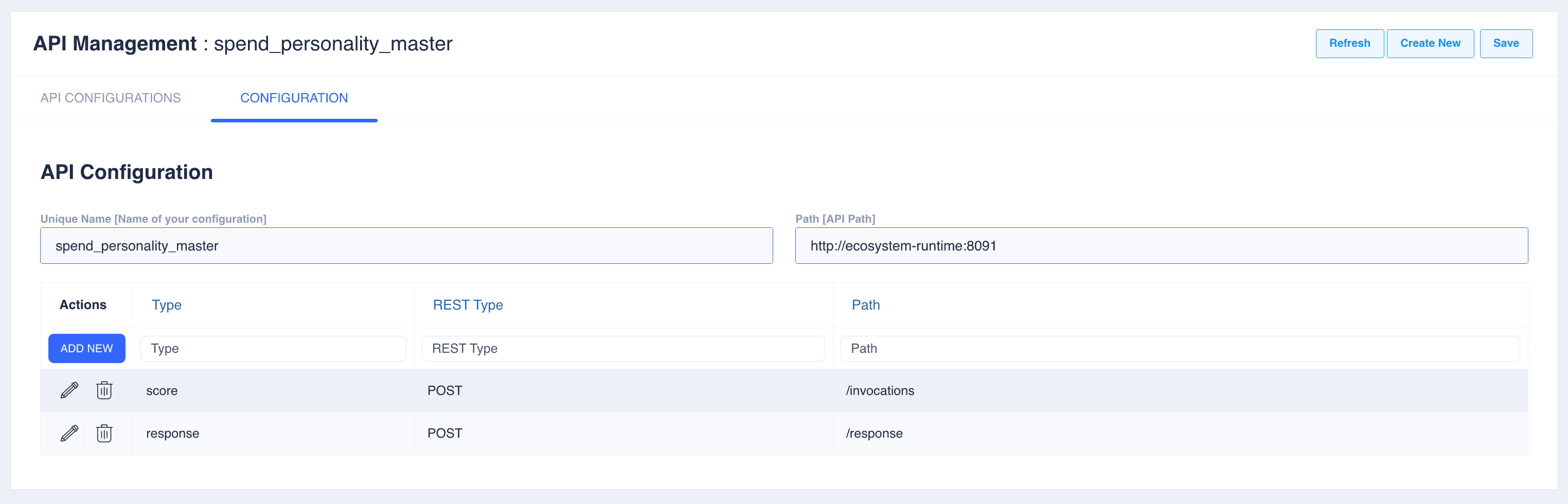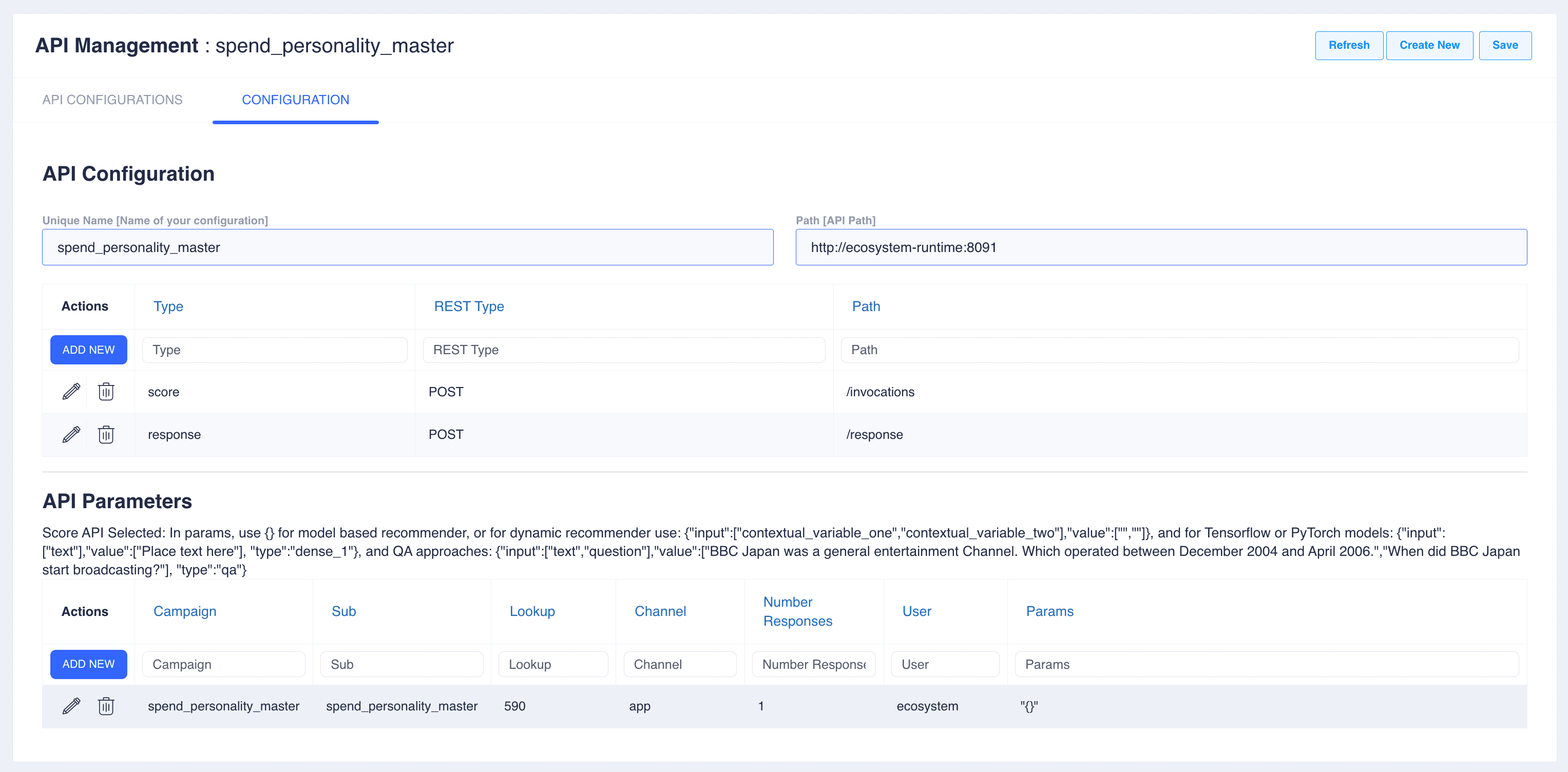 The API management functionality allows you to configure test calls to your deployed ecosystem.Ai runtime configurations.
